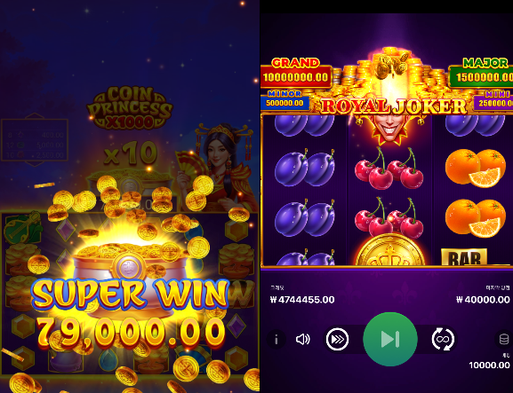 코인프린세스는 x10 키워서 슈퍼윈 뽑아주고, 옆에선 로얄조커가 또 잔잔하게 이어받아줌.