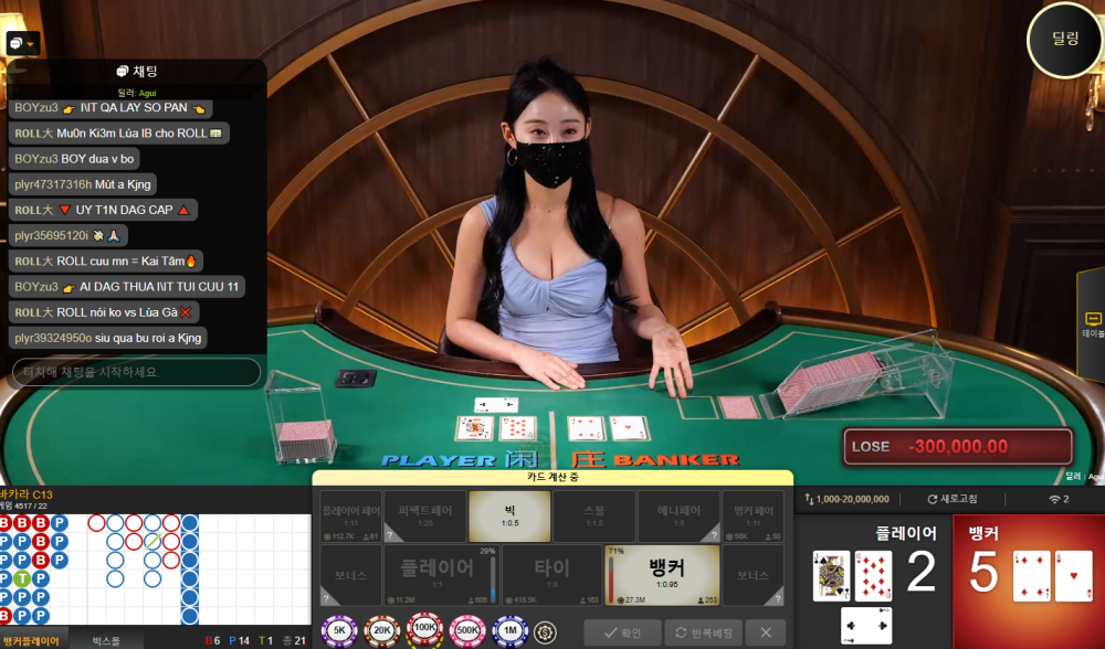 딜러 누나한테 홀려서 플레이어에 30만 박음 근데 카드 열자마자 느낌 옴.. 2점?