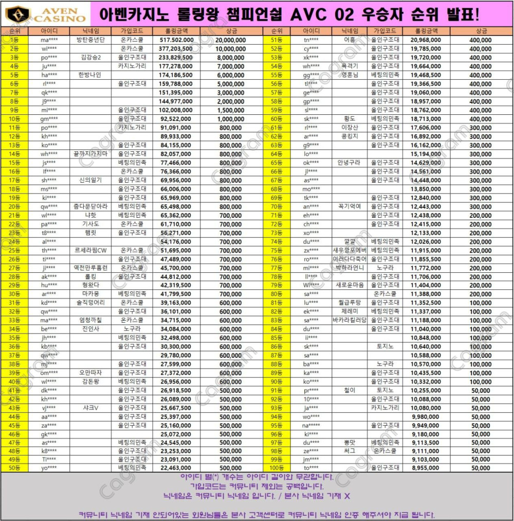 아벤카지노 롤링왕 챔피언쉽 AVC 02 우승자 순위 발표 !