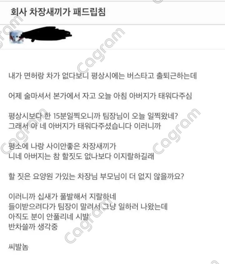 회사 차장새끼가 패드립침 글쓴이 카그램부영자쪽지보내기 메일보내기 자기소개 아이디로 검색 전체게시물쪽지보내기 메일보내기 자기소개 아이디로 검색 전체게시물 작성일2024.07.24 21:38 컨텐츠 정보 3,158 조회 3 댓글 0 추천 목록 본문 0 추천 관련자료 댓글 3 더빠르다님의 댓글 더빠르다쪽지보내기 메일보내기 자기소개 아이디로 검색 전체게시물쪽지보내기 메일보내기 자기소개 아이디로 검색 전체게시물 작성일 2024.09.04 05:52 개드겝 개드겝 포인트전사님의 댓글 포인트전사쪽지보내기 메일보내기 자기소개 아이디로 검색 전체게시물쪽지보내기 메일보내기 자기소개 아이디로 검색 전체게시물 작성일 2024.09.05 10:22 어이가없네 바로 퇴사 각 나온거지 뭐 어이가없네 바로 퇴사 각 나온거지 뭐 더빠르다님의 댓글 더빠르다쪽지보내기 메일보내기 자기소개 아이디로 검색 전체게시물쪽지보내기 메일보내기 자기소개 아이디로 검색 전체게시물 작성일 2024.09.07 23:37 패드립 패드립 로그인한 회원만 댓글 등록이 가능합니다. 목록